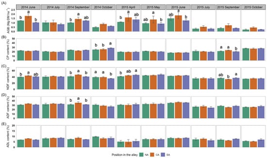 Average value of: (A) alley-cropping alfalfa above-ground biomass (AGB), (B) crude protein (CP), (C) neutral detergent fibre (NDF), (D) acid detergent fibre (ADF), and (E) acid detergent lignin (ADL) content per harvest time (from June 2014 to October 2015) of investigated position in the alley: north-facing side (NA), central part (CA) and south-facing side (SA). Vertical bars indicate standard error of the mean. Same letters indicate that treatments are not different at the 0.05 probability level according to Tukey’s HSD Test.
