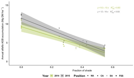 Linear regression of annual alfalfa above-ground biomass (AGB) accumulation in 2014 and 2015 with fraction of shade at the herbaceous layer. Colored lines indicate linear models and green and grey shades indicate standard error bounds for 2014 and 2015 data: NA means north-facing side, CA means central part, and SA means south-facing side of the alley, while FSS means alfalfa of the full-sun system.