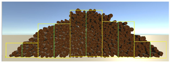 It can hence be assumed that another means for making these calculations is necessary given that the collection of data is, at that scale, practically unfeasible. Using the latest IT technologies and simulation approaches could be a more time and cost-effective solution. Consequently, the approach based on the implementation of a 3D simulation model to carry out these analyses was tested. The simulation model was programmed by “Dr. Philippe Guigue Software Artisan” as an important part of the project “Optimization of the wood supply chain-through analysis, evaluation and further development of log measuring methods and logistics processes in the round wood trade”. The programming of the simulation model as software was performed in the “.Net Framework” in C# programming language. It is based on a cross-platform game engine known as Unity software (version 2019.4.9f1), developed by Unity Technologies (San Francisco, CA, US). It makes it possible to reproduce virtually innumerable stacked piles (see Figure 1) and consequently it is not necessary to measure so many stacks in the field.