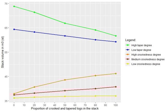 Stack volume variation according to increasing proportion of crooked and tapered wood.