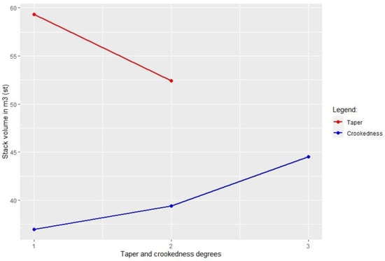 The graph represented in Figure 4 shows the variation of the stacked cubic volume (m3 (st)), represented on the y-axis, when the degree of crookedness and taper vary and the proportion of the crooked and tapered logs in stack remains unaltered according to Table 1. The different degrees of crookedness and taper are represented on the x-axis and correspond to the ranges defined above, more specifically the first degree of crookedness and taper corresponds to values under 10 mm/m, the second degree of crookedness and taper includes values between 10 and 20 mm/m and the third degree of crookedness corresponds to values over 20 mm/m.