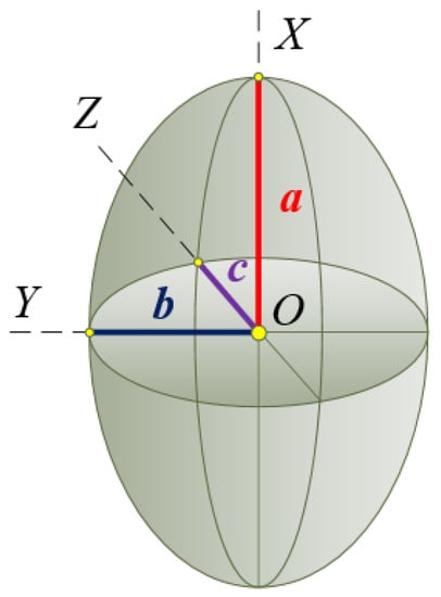 The Scots pine seed shape used in the study. a, b, and c are semi-axes of the ellipsoid, located along the X-, Y-, and Z-axes from three-dimensional coordinate system, respectively.