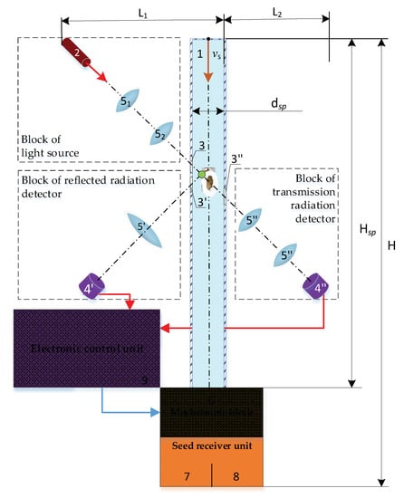 Figure 2 shows the scheme for the optical detection of a single seed in the diagnostic system of the optoelectronic grader. The diagnostic system includes a block of light source, a block of reflected radiation detector, a block of transmission and reflected radiation detector and closely interacts at the level of analog signals with an electronic control unit. An electronic control unit (usually including a multiplexer, analog-to-digital converter (ADC), and microprocessor) receives optical measurement signals; i.e., diffuse reflectance, from the detector, summarizes them in a multiplexer, and transmits them via an ADC to a microprocessor which processes them using fuzzy logic methods and transmits the received control signal to the actuators of the mechatronic unit of the calibration system. Note that we focused on diffuse reflectance measurements in this system. Depending on the selected separation algorithm, the actuators change the trajectory of a single seed, directing it to the appropriate seed receiver 7 or 8.