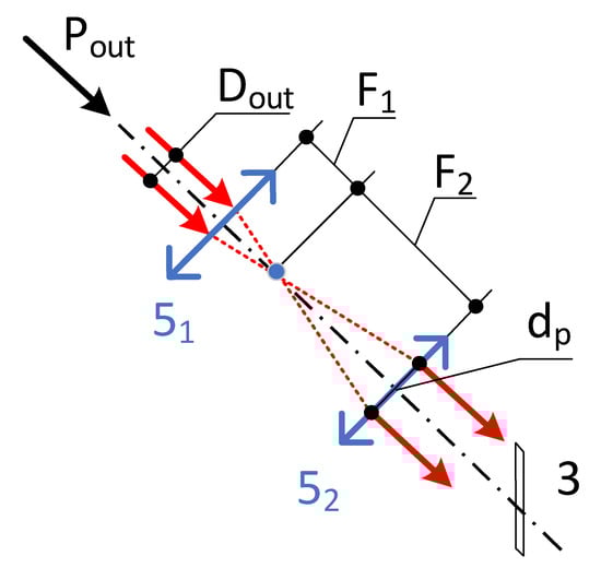Beam expansion in the block of light source. Here, 3 is the window through which the beam enters the seed pipe. F1 is the focal length of the lens 51, F2 is the focal length of the lens 52 in Figure 2, Pout, Dout and dp are output power of the light source, diameter of the radiation beam at the output of the light source, and diameter of the beam before entering the seed pipe, respectively.