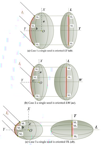 - Case 1: a single seed is oriented by LT projection (ab), that is, the length (L)–thickness (T) projection of a seed, forming the incidence of a beam when detecting, which is determined by the equation of an ellipse with semi axes a and b as . Here, x and y are axes of the coordinate system associated with the seed x,y-plane projection of the x,y,z coordinate system (see Figure 1).