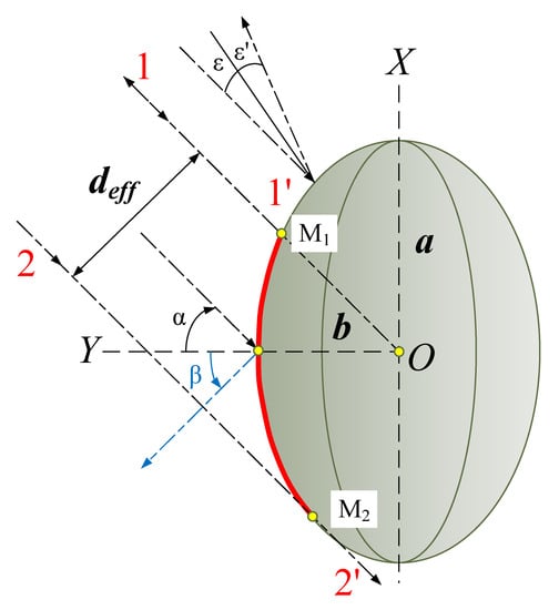 In the first case in the plane of incidence of the beam, the ellipsoid is an ellipse with the following semi axes , . In this case, the reflecting surface will be bounded by the two extreme incident beams (1-1′ and 2-2′) that are reflected from the surface of the ellipsoid (Figure 5).