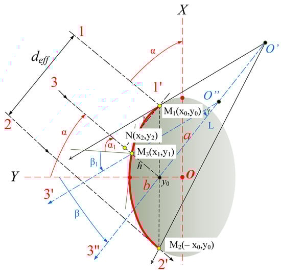 Radiation that falls on an ellipsoid outside the critical point M1 is reflected at an angle that cannot be focused onto a photodetector (No. 4 in Figure 2). Radiation is reflected in the opposite direction from the photodetector, while at the critical point M1, itis reflected back. At the critical point M2, the incident ray slides along the surface of the ellipsoid. These two extreme rays determine the effective beam width deff. It seems obvious that a reflected beam of radiation with an angular width equal to 180° (the angle between rays 1′ and 2′) cannot be focused onto a photodetector. In this case, the main light flux will be reflected at an angle β = α according to the law of light reflection. It is very important to choose the angle of incidence α, and therefore, the angle of reflectance β. At small angles of incidence, it is difficult to separate the incident and reflected radiation streams. At large angles of incidence, the reflected flow will slide along the surface of the ellipsoid, while the entire flow will propagate in a large solid angle. Therefore, for consideration, we chose the angle of incidence α = 45° as a certain average value between the two-extreme means. We determined the position of the extreme points M1(x0,y0) and M2(−x0,y0) on the generated (ellipse) plane of incidence of the radiation that determines the effective angular width of the reflected beam (Figure 6).