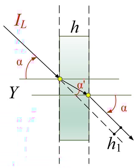 The calculation using Equation (20) shows that for quartz with a plate thickness of up to 3 mm, the beam offset does not exceed 1 mm (the same value will be for the recording window 3 in Figure 2). The deviation of the beam does not have a strong effect on the change in the overall dimensions of the diagnostic system of the separation device, but should be taken into account when adjusting.