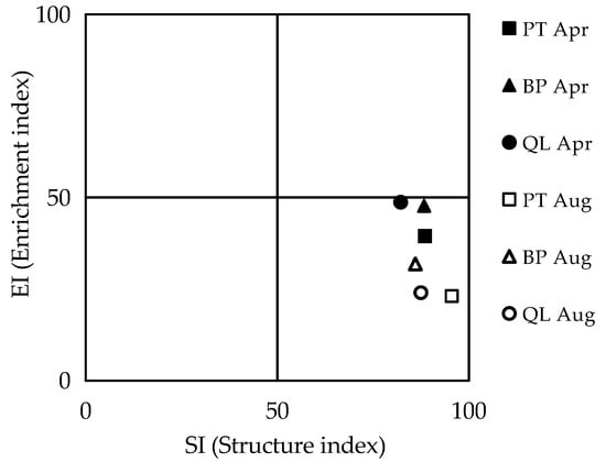 - Pielou, E.C. The measurement of diversity in different types of biological collections. J. Theor. Biol. 1966, 13, 131–144. [Google Scholar] [CrossRef]