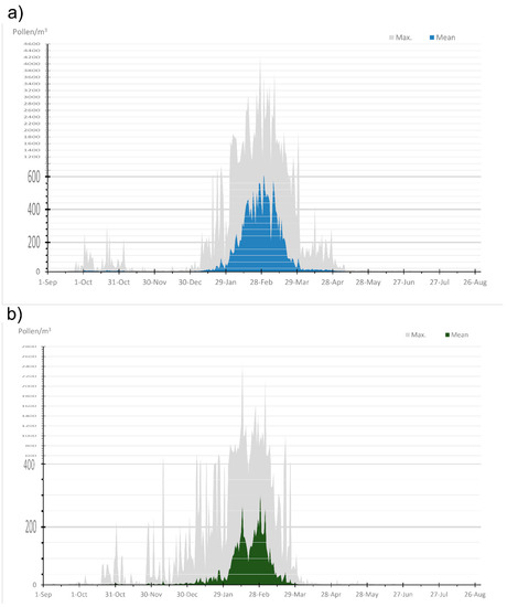 The main species of Cupressus present in these cities are C. sempervirens and C. arizonica, although it is possible to find C. lusitanica and C. macrocarpa as ornamental plants used occasionally in both urban spaces and surrounding. Although the flowering start of these species varies, their flowering periods are usually overlapped. Juniperus species also appear in both provinces [32], but far from the cities, and their pollen is not well represented in the urban air. Some papers have reported that Cupressaceae pollen season usually starts in this region during autumn, depending on the different species [2,3,6].