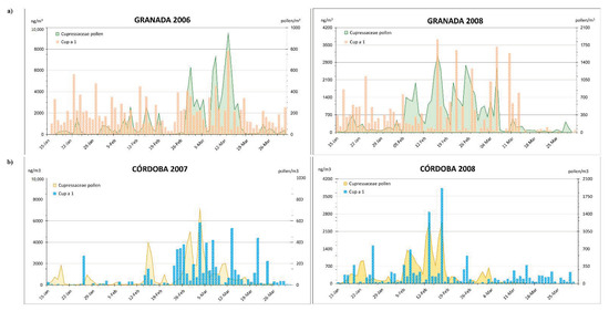 In Granada, positive and significant correlations between Cupressaceae pollen and Cup a 1 during 2005–2006 and 2007–2008 were registered (0.200 and 0.282; p < 0.05, respectively). In Córdoba, positive and significative correlations between both variables (0.515; p < 0.01) occurred during 2006–2007 but not for 2007–2008 (Table 2).