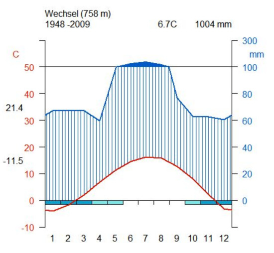 Figure 1. The Walter–Lieth diagram is based on a 60-year record of climate data collected at the closest climatological monitoring site, which is located 600-m below the experimental site (