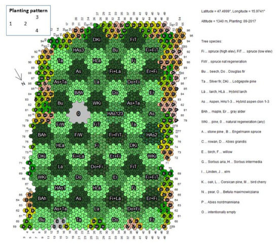 The Austrian Forest Act limits the size of clear-cut areas and extra permission is required to justify a larger open area. We aimed at accommodating 31 treatments (single-species plots and plots with tree species combinations, with up to 3 replicates for each treatment;