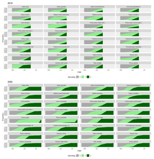 Sorbus aucuparia) developed quickly, obviously rapidly responding to increasing temperatures. The conifers (pines, firs, larches, and spruces) are showing a slower start in spring. The differences within the Norway spruce provenances are minor. The gradual development in the two compared years is similar. In 2019, the phenology was monitored until the end of June. In 2020, the monitoring period was greatly extended in order to fully capture the needle-unfolding of the particularly slowly developing Corsican pine (