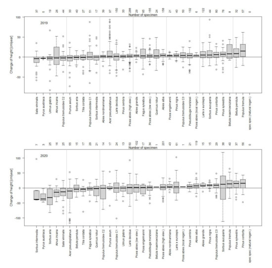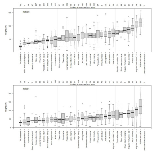 Figure 4. Considering that the grasses were more than half a meter high, many tree species were overgrown by grasses and primarily deciduous trees, which were delivered as taller seedlings reached over the canopy of the grasses. The measured differences in heights of different tree species were consistent between years. The ‘number of specimen’ at the top of the graph indicates the number of measured tree seedlings. It reflects and takes into account that many tree seedlings have died off for a number of reasons (compare