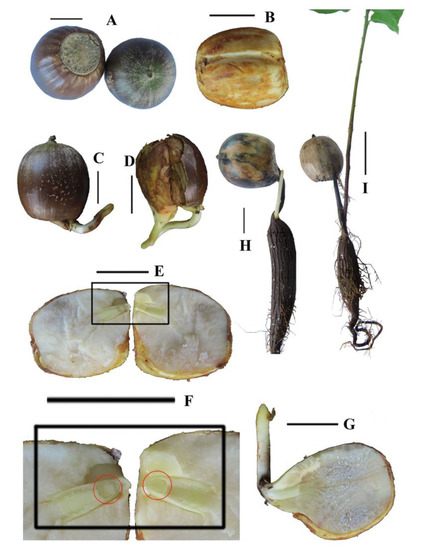Fruit and seed morphology photographs of Q. chungii seed germination. A, fruit; B, seed; C,D, start of seed germination (C, one seed in one fruit; D, two seeds in one fruit); E, morphology of seeds; F, elongation of cotyledonary petiole and embryo axis (red circle); G, seed morphology after cotyledonary petiole had protruded through the fruit coat; H, shoot germination; I, seedling. In each panel, a separate scale bar of 1 cm is shown.