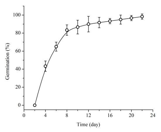 Percentage of cumulative germination of Quercus chungii seeds initiating germination at room temperature.