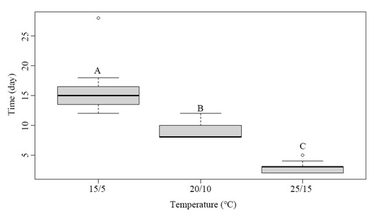 Mean time (days) needed for root emergence under different temperature conditions. Different uppercase letters indicate significant differences between the incubation temperature regimes (Tukey’s HSD test, p = 0.05).