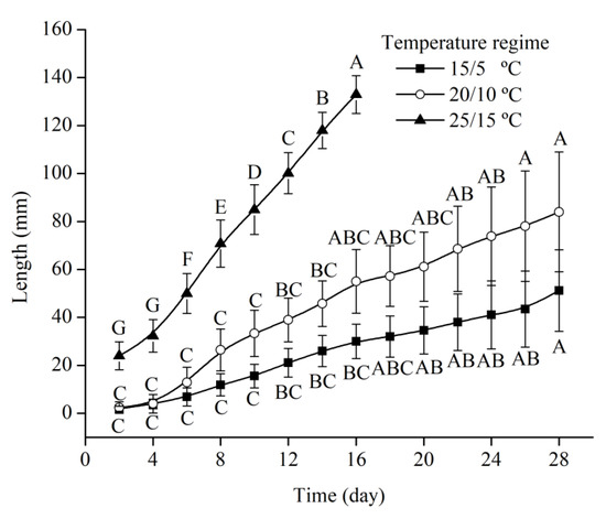 Length of elongated cotyledonary petiole and root of Quercus chungii under three temperature regimes. Different uppercase letters indicate significant differences between the different time points under the same incubation temperature regime (Tukey’s HSD test, p = 0.05).