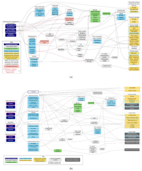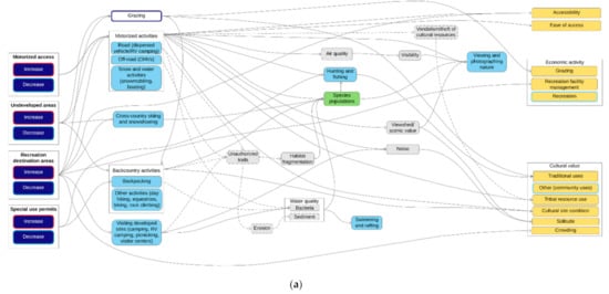 The base ESCM, which is designed for project scale recreational management (Figure 2a) [], provided a useful starting place for dialog focused on adjusting and adapting the model for planning and the Ashley National Forest context. The resulting forest plan scale model (Figure 2b) is significantly different from the project scale model as follows: