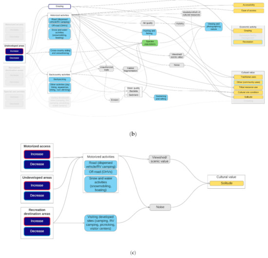 The Duke team proposed several simplified versions of the ESCM for possible communications tools. These included a version with many intermediate nodes removed (Figure 3a), a version showing the impacts for each management category separately (Figure 3b), and a version showing how different management activities connected to a single outcome (Figure 3c). We also discussed how the models could be used to show expected positive or negative relationships from a specific management choice (e.g., increase motorized access), indicated by color coding the arrows in a model. The Ashley team decided not to move forward with any of these, but recognized the potential use of these simplified models for communication of linkages between proposed management and socioeconomic outcomes for internal or external audiences.