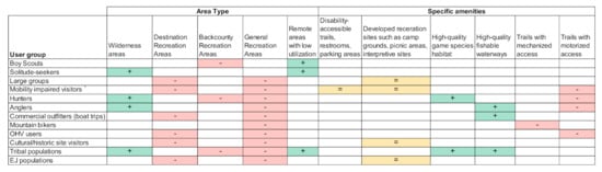 The access and quality of experience matrix can be used to visualize impacts to different forest user groups. Shaded cells at the intersection of a user group (rows) and area or amenity types (columns) indicate that the user group cares about that area or amenity. The colors indicate the direction of the effect that the Forest Plan alternative is expected to have on each type of use area and amenity, and therefore on interested user groups. This is a hypothetical example for the conservation focused planning alternative, with a focus on non-motorized recreation in backcountry, proposed wilderness areas and other undeveloped areas and reduced emphasis on recreation infrastructure development, compared to the no-action alternative. 1 Including those with mobility disabilities and elderly visitors.