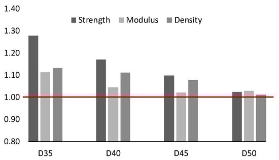 Among the material properties, stiffness was the limiting one for the grading. Figure 1 shows the ratio between the characteristic values achieved by the pieces assigned to a class by the machine (in the figure, only the strength grading machine using the dynamic modulus of elasticity as grading property) and the values required for strength, stiffness, and density. The strength and the density were always well above the requirements (ratio far higher than 1), while the modulus of elasticity presented the lowest ratio, i.e., the characteristic values were close to the requirement. Strength and density also got closer to the characteristic values of the class only for the highest class (D50). Similar results were observed when the velocity was used as the grading property.