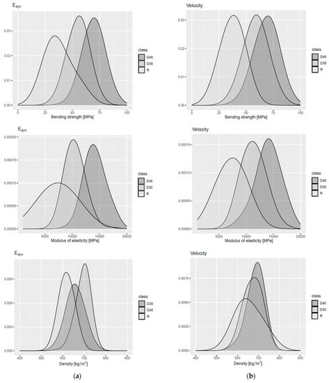 Figure 2. Density curves for bending strength, modulus of elasticity, and wood density of the three classes (D45-D30-R) sorted by the machine grading, by the dynamic modulus of elasticity (a) and the velocity (b).