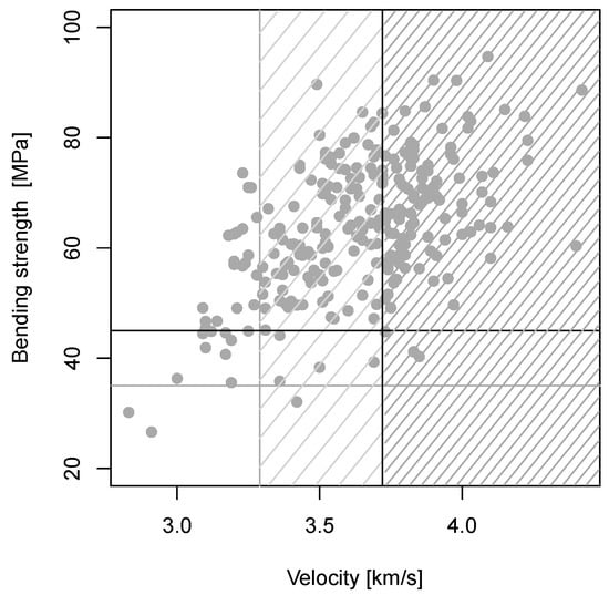 Figure 3. Scatterplot of bending strength vs. velocity measured on wet timber and not adjusted for moisture content. Vertical lines = settings recalculated at 40% MC for D35 (grey) and D45 (black); horizontal lines = characteristic values of strength for the classes D35 (grey) and D45 (black); sparse oblique lines = pieces assigned to D35; dense oblique lines = pieces assigned to D45.