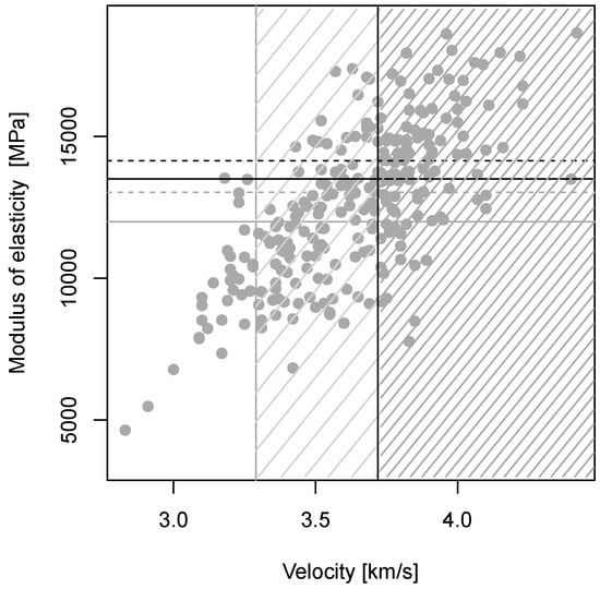 Figure 4. Scatterplot of static modulus of elasticity vs. velocity measured on wet timber and not adjusted for moisture content. Vertical lines = settings recalculated at 40% MC for D35 (grey) and D45 (black); solid horizontal lines = mean values of modulus for the classes D35 (grey) and D45 (black); dashed horizontal lines = mean values of modulus of pieces assigned to D35 (grey) and D45 (black); sparse oblique lines = pieces assigned to D35; dense oblique lines = pieces assigned to D45.