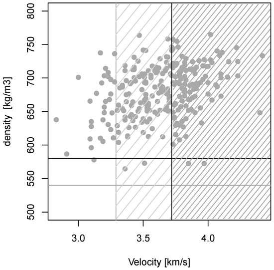 Figure 5. Scatterplot of density vs. velocity measured on wet timber and not adjusted for moisture content. Vertical lines = settings recalculated at 40% MC for D35 (grey) and D45 (black); horizontal lines = characteristics values of density for the classes D35 (grey) and D45 (black); sparse oblique lines = pieces assigned to D35; dense oblique lines = pieces assigned to D45.
