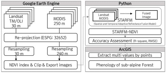 In this study, the identification of forest phenological characteristics and creation of a time-series of phenological changes at the species–community level was conducted in three main stages (Figure 2): (1) medium-spatial and high-temporal resolution products (Landsat OLI, Thematic Mapper (TM), MODIS MOD09GQ, and MOD13Q1) were obtained from the Google Earth Engine (GEE, https://developers.google.com/earth-engine/datasets, accessed on 2 March 2021); (2) the Landsat 30-m images were fused with the MODIS 500-m images using STARFM, to produce synthetic imagery, and an accuracy assessment through the R-square and RMSE was conducted to set the optimal parameters for STARFM; (3) NDVI images, predicted through STARFM, were then classified by referencing the forest community distribution map of the current Mount Halla Absolute Conservation Area, and the time-series was analyzed for phenological changes in growth characteristics.