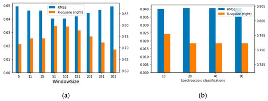 The two parameter values, namely the size of the search window and the number of classes, were set through pilot prediction. In accordance with previous studies [27], the pilot prediction was conducted by setting the size of the search window to 5, 10, 25, 50, 100, 150, 200, 250, and 300 [27]. As a result of the pilot prediction, when the window size was set to 50, the R2 (0.795) and RMSE (0.0402) values indicated a sufficient accuracy of the model (Figure 3a). The number of classes was set to 10, 20, 40, and 80, and the pilot prediction was carried out. The RMSEs for the different number of classes were similar, but the highest accuracy (R2 = 0.795) was obtained when the number of classes was set to 10 (Figure 3b). These STARFM accuracy evaluation results were similar to those (R2: 0.69–0.86, RMSE: 0.06–0.11) of [38] and were acceptable results. Based on the pilot prediction results, image fusion and prediction were performed with a search window of 50 and a number of classes of 10. Even though the images from the prediction period were used as 16-day composites, there was one case where a cloud existed in the prediction result. Because clouds were found mainly in the images from the summer period, the images of the summer period were excluded from later seasonality analysis.