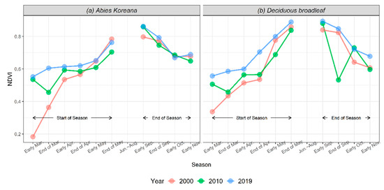 Deciduous broad-leaved forests generally have higher NDVI values than Abies koreana since the latter is a coniferous tree. Abies koreana showed the highest NDVI value in September due to its growth characteristics. In contrast, in 2000, the NDVI value of Abies koreana was low, and the start of the season was later than that of deciduous broad-leaved forests. Considering that Abies koreana is a coniferous tree, such an increase in NDVI is a peculiar phenomenon. These results are similar to those of previous studies [17,54] and are likely due to climate change creating a longer growing season. Therefore, for rare species like Abieas koreana, sensitive to climate change, continuous NDVI monitoring is needed to observe climate change phenomena and preserve ecosystems.