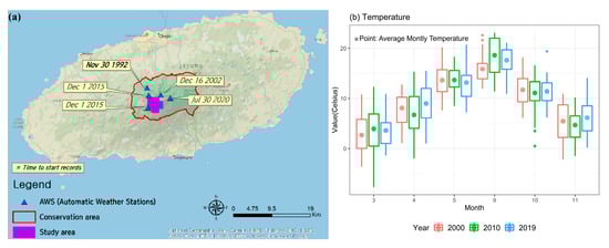 A map of forest type in the study area was acquired from the Korean Ministry of Environment. The map depicts vegetation classes (Abies koreana derived from multi-season 2015–2017 aerial imagery mapped at 20 cm resolution). The phenology was then analyzed based on the forest type map. Also, the average monthly temperatures of 2000, 2010, and 2019 were obtained from the automatic weather stations (AWS) provided by the Korean Meteorological Administration (KMA) to find the relationship between NDVI and temperature increase.