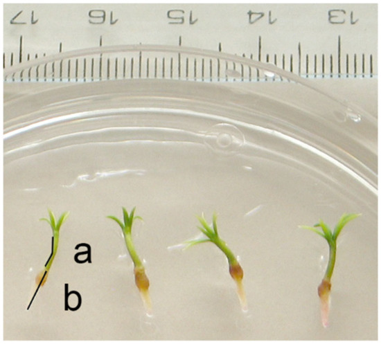 Norway spruce embryos after two weeks’ germination and the illustration of the measurement of the shoot (a) and root meristems (b). The ruler was for calibration of the ImageJ software, distance of the short lines is mm.