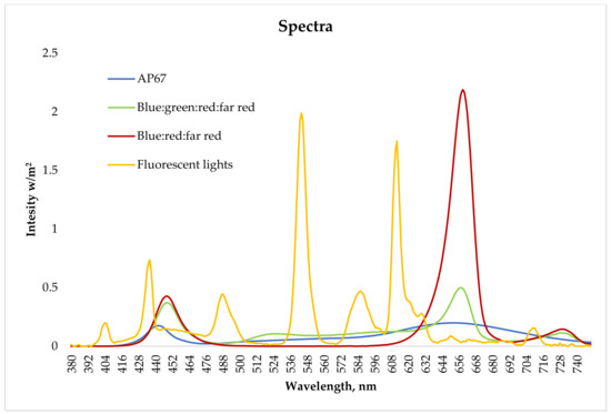 The spectra and intensities of the fluorescent and led lights used in the germination experiments (Experiment III). In the maturation experiment (Experiment II) AP67, blue:green:red:far red, and blue:red:far red spectra were used, but the intensities were lower.