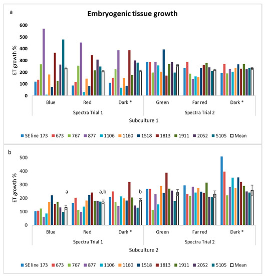(a,b). Experiment I: the growth percentages of Norway spruce embryogenic tissue (ET) when 11 somatic embryogenesis (SE) lines were proliferated under different spectra. In the experiment one sample from each SE line was placed in each spectrum. The asterisk (*) represents the same control treatment in which the ET was proliferated, and somatic embryos were matured in the dark. The mean values of the SE lines combined (Total) are presented with standard error bars. Significant differences between the mean values within each trial are marked with differing letters. The 95% confidence level was used.