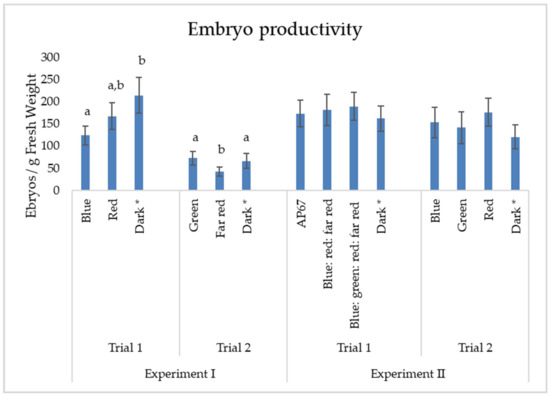 Norway spruce somatic embryo production capacity in Experiment I, in which ET was proliferated under different light spectra, and then the embryos were matured in the dark. In Experiment II, developing embryos from ET proliferated in the dark were kept under different light spectra for 29 days at the end of maturation. The mean values are presented with standard error bars. Significant differences within each trial are marked with differing letters. The asterisk (*) in different experiments represents the same control treatment in which the ET was proliferated, and somatic embryos were matured in the dark. The 95% confidence level was used. The differences in embryo productivity between SE lines are illustrated in Supplementary Figure S1.