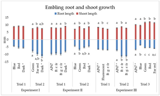The root and shoot length of germinated embryos from Experiment I, in which ET was grown under different light spectra, the embryos were matured in dark and germinated under AP67 light; Experiment II in which embryos from ETs grown in dark were matured for the last 26 days under different spectra and then germinated under AP67 light; and from Experiment III in which embryos from ET grown and matured in the dark were germinated under different spectra. The mean values are presented with standard error bars. The asterisks (*) in the different experiments represent the same control treatment in which ET was proliferated, and somatic embryos were matured in the dark, and the embryos were germinated under light in the AP67 spectrum. Significant differences within each trial are marked with differing letters. The 95% confidence level was used. The differences in root and shoot lengths between SE lines are illustrated in Supplementary Figures S2–S4.
