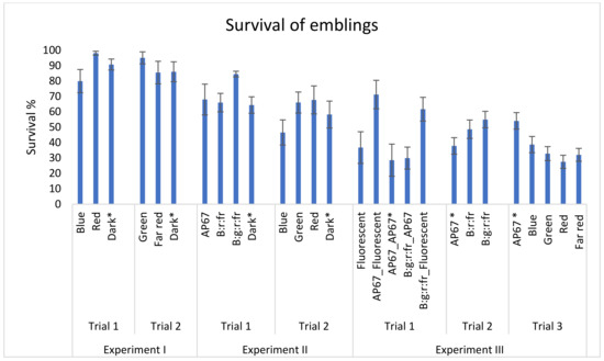 Survival percentages of emblings after six weeks’ growth (or four weeks in Experiment III Trial 1) in growth containers. In Experiment I ET was grown under the light spectra shown in the figure, embryos were matured in the dark and germinated under AP67 spectrum light. In Experiment II embryos from ET grown in the dark were matured for the last 26 days under the light spectra shown in the figure, and then germinated under AP67 spectrum light. In Experiment III embryos from ET grown and matured in the dark were germinated in the spectra shown in the figure. The emblings were kept in growth containers under AP67 spectrum light except in Experiment III Trial 1 where they were kept under AP67 light and fluorescent lights in a climatic chamber. The treatments marked with an asterisk (*) in the different experiments represent the same control treatment in which the ET was proliferated, and the somatic embryos matured in the dark, while the embryos germinated and grew under AP67 spectrum light. The differences in survival of emblings between SE lines are illustrated in Supplementary Figures S5 and S6. The results from logistic regression analysis used to examine the differences in survival of the emblings (0 = dead, 1 = alive) are in Supplementary Tables S11–S14.