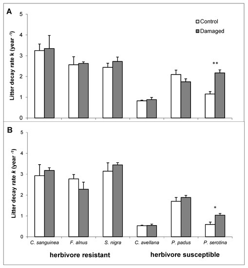 Coefficients of leaf litter decomposition (mean ± SE) of six understory plant species (the three species on the left are resistant and the three on the right are susceptible to herbivory) in two stand species (n = 3; three bags/species in each stand/damage treatment): (A) oak and (B) pine monoculture. Significant differences between control and damaged and leaves within the same plant species are shown with asterisks (* p < 0.05 and ** p < 0.01).