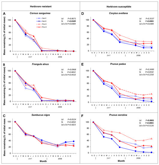 Dynamics of leaf litter decomposition of six understory plant species (herbivore resistant species: Cornus sanguinea—(A), Frangula alnus—(B), Sambucus nigra—(C), on the left and herbivore susceptible species: Corylus avellana—(D), Prunus padus—(E), Prunus serotina—(F), on the right), depending on leaf damage (Ld; control (C) and damaged (D)) in two stand species (St; oak and pine monocultures).