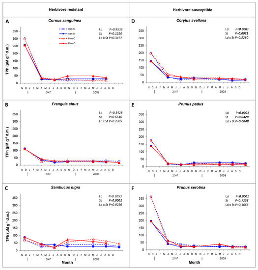 Changes in content of total phenols (TPh; expressed as μM of chlorogenic acid g−1 d.m.) in leaf litter of six understory plant species (herbivore resistant species: Cornus sanguinea—(A), Frangula alnus—(B), Sambucus nigra—(C), on the left and herbivore susceptible species: Corylus avellana—(D), Prunus padus—(E), Prunus serotina—(F), on the right), depending on leaf damage (Ld; control (C) and damaged (D)) in two stand species (St; oak and pine monocultures).