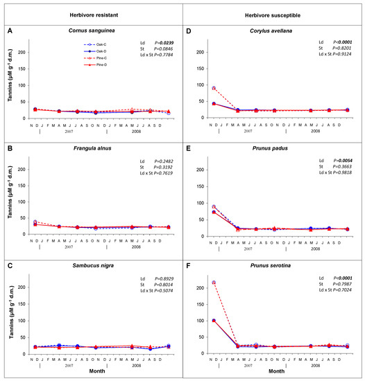 Changes in content of tannins (expressed as μM of catechin g−1 d.m.) in leaf litter of six understory plant species (herbivore resistant species: Cornus sanguinea—(A), Frangula alnus—(B), Sambucus nigra—(C), on the left and herbivore susceptible species: Corylus avellana—(D), Prunus padus—(E), Prunus serotina—(F), on the right), depending on leaf damage (Ld; control (C) and damaged (D)) in two stand species (St; oak and pine monocultures).