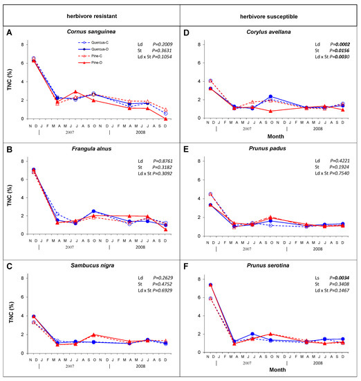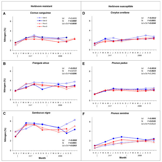 Changes in content of nitrogen (% d.m.) in leaf litter of six understory plant species (herbivore resistant species: Cornus sanguinea—(A), Frangula alnus—(B), Sambucus nigra—(C), on the left and herbivore susceptible species: Corylus avellana—(D), Prunus padus—(E), Prunus serotina—(F), on the right), depending on leaf damage (Ld; control (C) and damaged (D)) in two stand species (St; oak and pine monocultures).