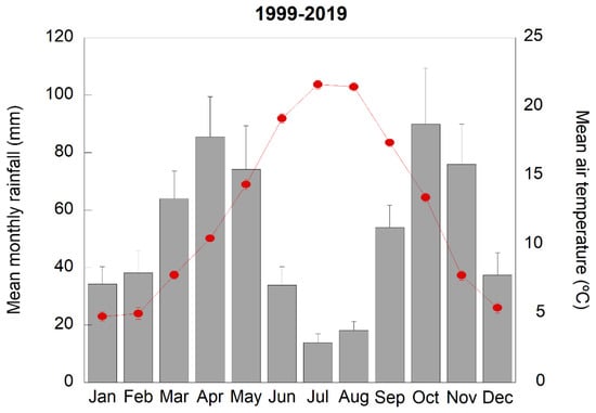 Average meteorological conditions at the study site during the experimental period (1999–2019). Red dots indicate mean monthly air temperature and grey columns indicate mean monthly rainfall. Vertical bars in the grey columns and red dots indicate the standard error of the mean (n = 21 years).