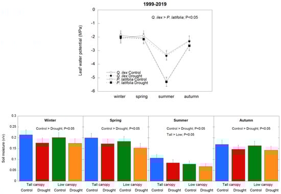Average seasonal leaf water potential (upper panel) and soil moisture (lower panel) during the study period (1999–2019). Vertical bars indicate the standard error of the mean (n = 21 years).