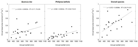 Linear regression analysis of annual basal area increment (BAI) and annual rainfall in Q. ilex, P. latifolia, and all tree and shrub species. n = 21 years.