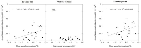 Linear regression analysis of annual basal area lost by stem mortality (BAL) and mean annual temperature in Q. ilex, P. latifolia, and all tree and shrub species. n = 21 years.